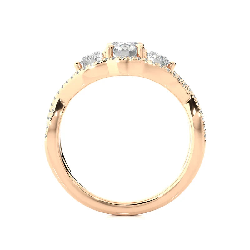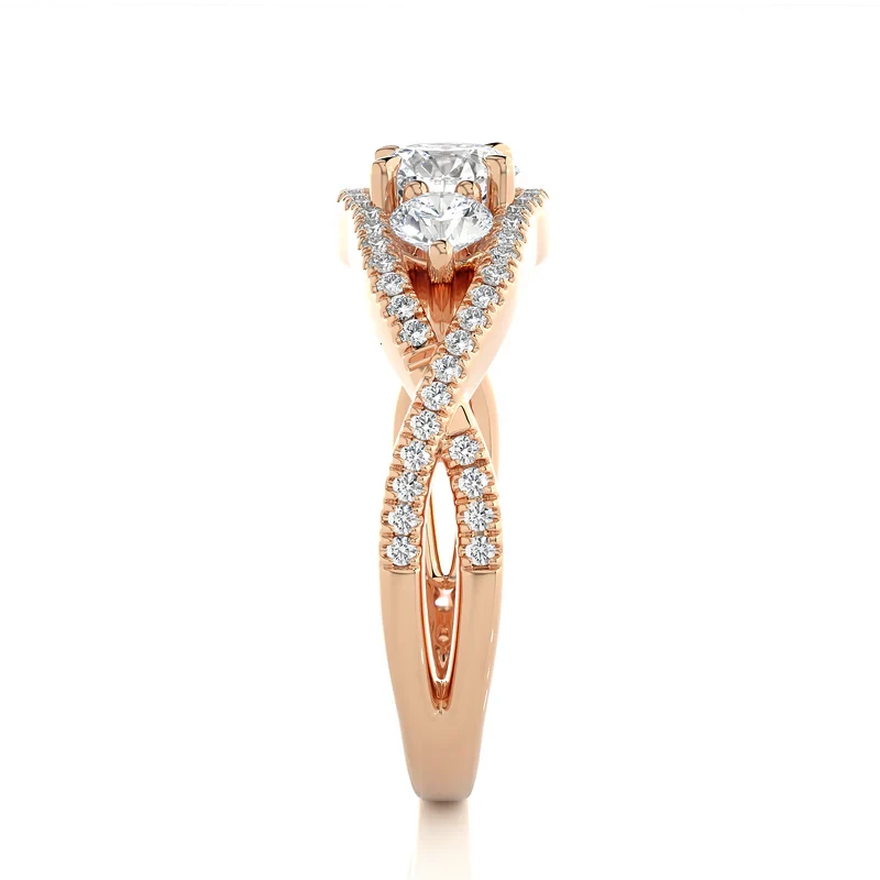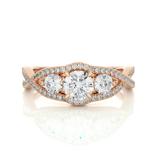 1.50 Carat Round Moissanite Three Stone Twisted Engagement Ring in Rose Gold