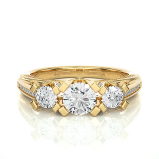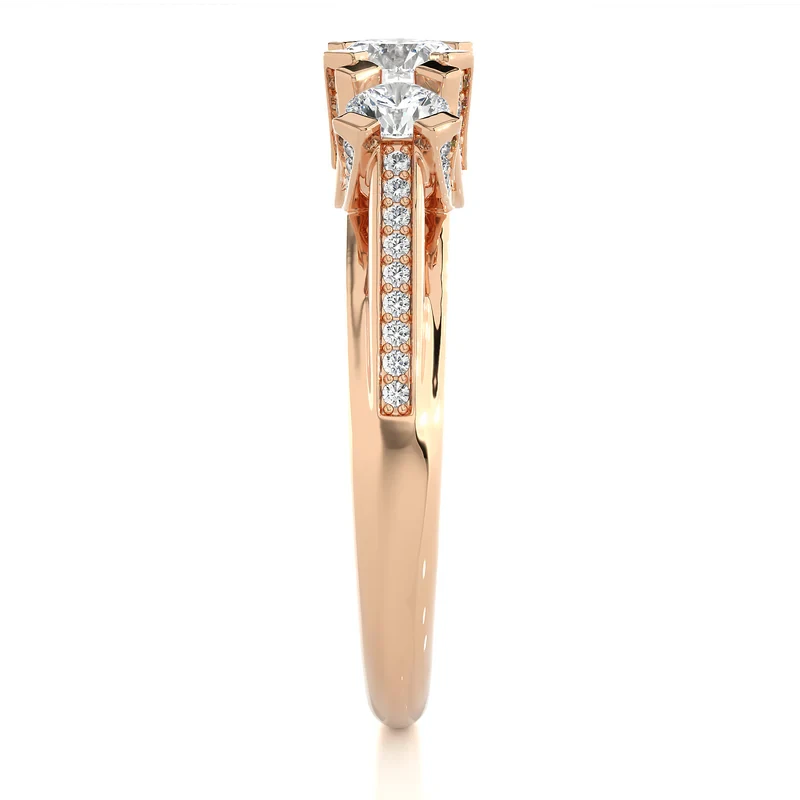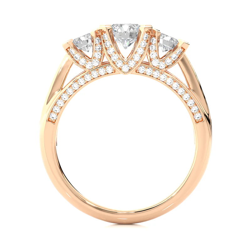 Get this amazing 1.50 Ct Three Stone Moissanite Ring With Accents, as this ring shows the everlasting shine of moissanite stone which are been placed in rose gold metal. The accents are been placed in a unique manner adding sparkle to the look of the ring. Get this moissanite ring at the most suitable price.