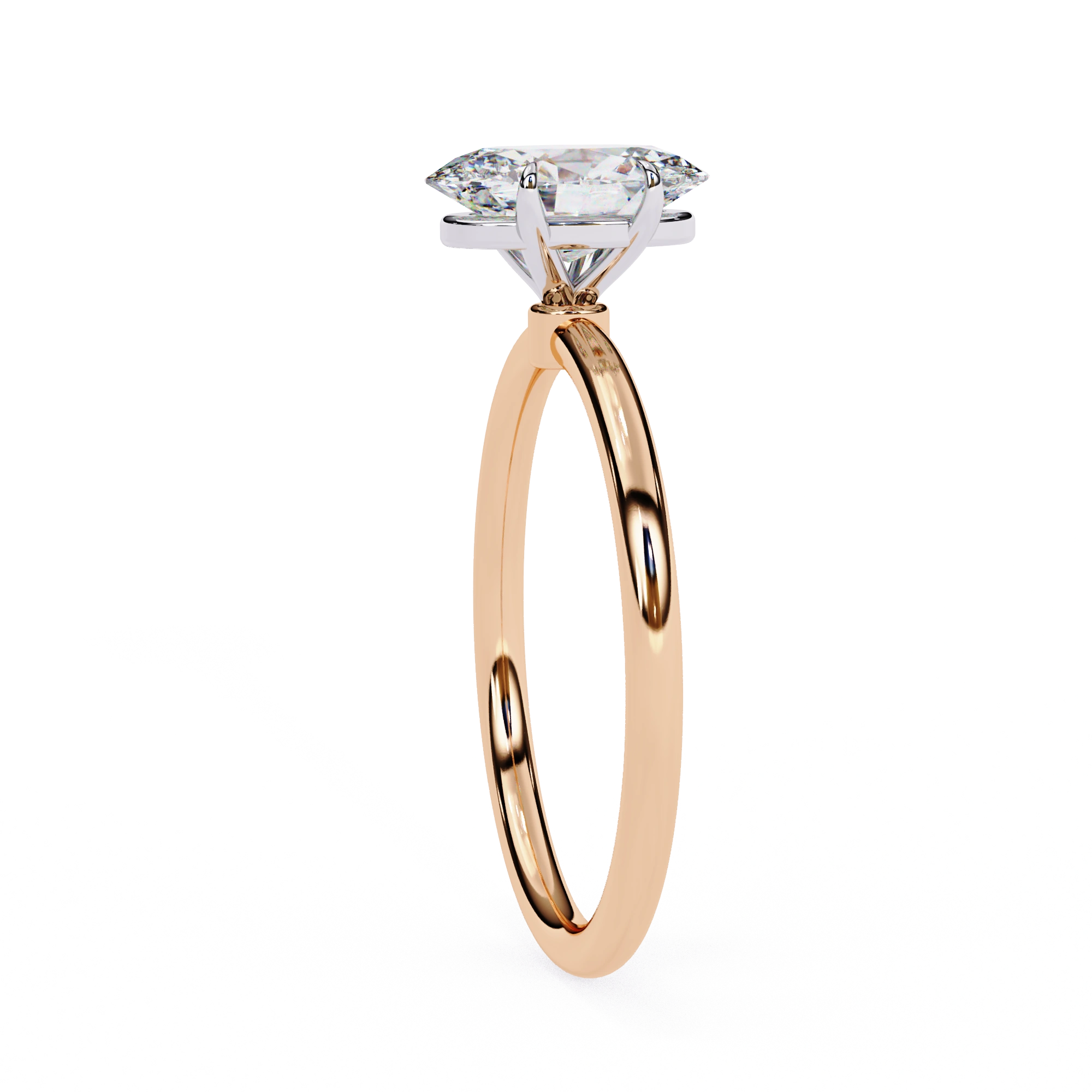 Crafted with a luminous oval moissanite centerpiece, this engagement ring features a warm rose gold band complemented by white gold prongs that secure the stone perfectly. The moissanite's precision faceting produces remarkable light performance, with intense sparkle and rainbow flashes that catch the eye from across the room. Its high clarity grade ensures a clean, flawless appearance, while the smooth solitaire design keeps the focus on the stone's natural beauty. Built for both special moments and everyday wear, this ring offers exceptional quality and lasting appeal. The romantic rose gold tone creates a distinctive feminine touch that's increasingly popular among modern couples. Shop more oval engagement rings or explore our complete rose gold moissanite collection today.