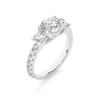 Anillo con detalle de tres piedras de moissanita redondo de 2,5 quilates en oro blanco