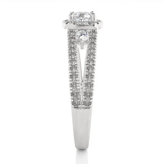 This 2-carat cushion-cut moissanite three-stone halo ring in silver is truly stunning. The split shank and detailed setting really highlight the brilliance of the stones, making it a very impressive piece of jewelry.