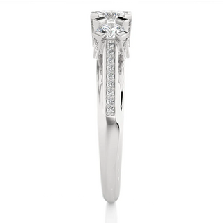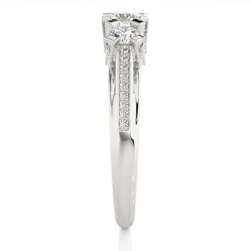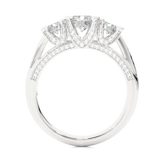 This beautiful three-stone ring features a sparkling 1.50 Ct moissanite center stone, accented by two smaller gems in a polished silver setting. The craftsmanship is excellent and the design is truly elegant.